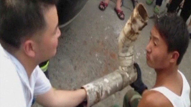 The state-run news site Zhejiang News says a tenant heard the baby's cries in the public restroom of a residential building in eastern China's Puijian county Saturday and notified authorities. Firefighters removed an L-shaped section of the pipe -- about 10 centimeters in diameter -- and rushed it to a hospital where it was dismantled and the baby was treated.